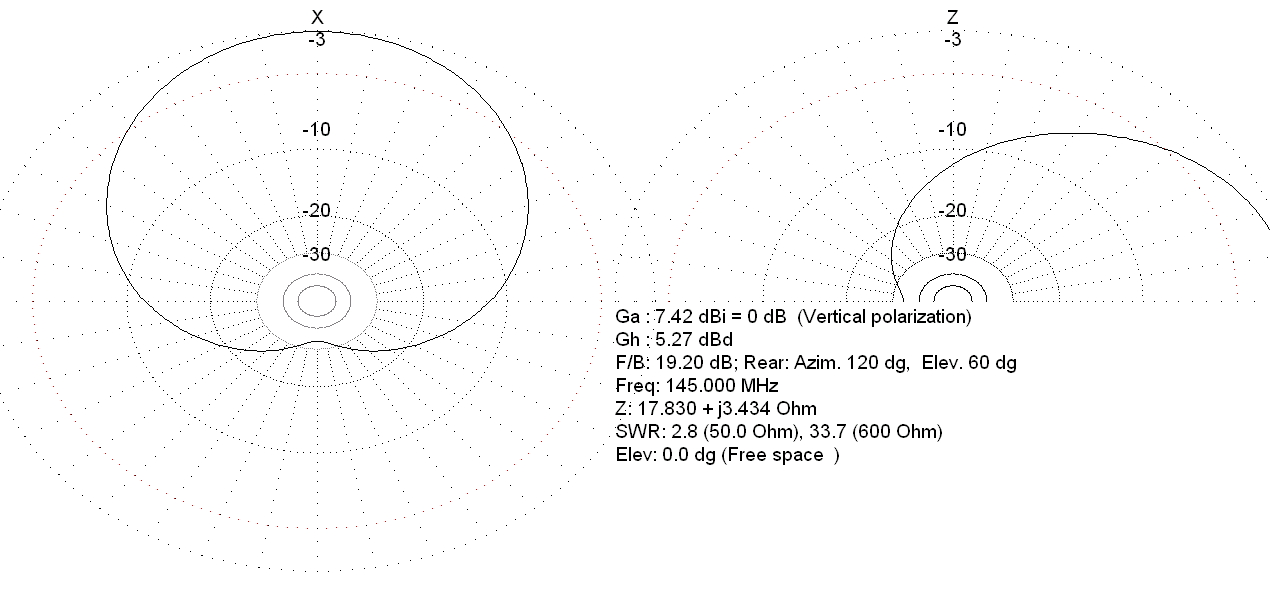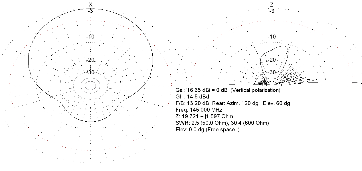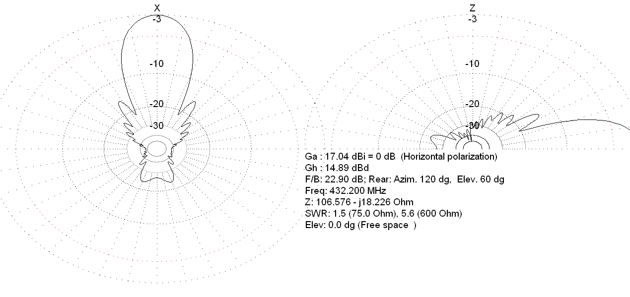 А вот нашел в моделях антенну от F9FT (f9ft-21-432.maa) длиной порядка 6,6λ - для 70см это будет порядка 4,6м, а для двойки под 14м, что на деле почти неосуществимо. Да, здесь модель антенны линейной поляризации - для круговой элементы нужно удвоить с 21 до 42 или сделать две отдельные антенны, а усиление линейной у круговой поляризации напрямую сравнивать нельзя (разница в 3dB). Но обрати внимание, что здесь боковые лепестки изначально хорошо придушены. Если фазировать такие антенны в стек (а так и делают для EME и VHFDX), то усиление стека вырастет, но и боковые лепестки тоже вырастут, т.к. они усиливаются так же, как и основной.