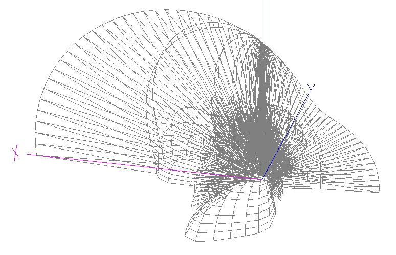 Теперь попробуем редко используемый, но возможный вариант - восемь таких антенн в ряд. Рассмотрим как вертикальный, так и горизонтальный ряд - они одинаковы, но сжатие заметно либо по оси Y, либо по оси Z. Сильное сжатие по вертикали и широкая диаграмма по горизонтали может быть удобна для наземной связи, когда перекрывается большой сектор горизонта, но "усиление" очень высоко за счет минимизации излучения выше и ниже горизонта. Для спутниковой же связи такая конфигурация хороша только в том случае, когда возможно поворачивать антенну так, чтобы виток спутника попадал в узкую "полоску" диаграммы и все время проходил в районе максимума направленности. Для фиксированной антенны это, конечно, неприменимо.