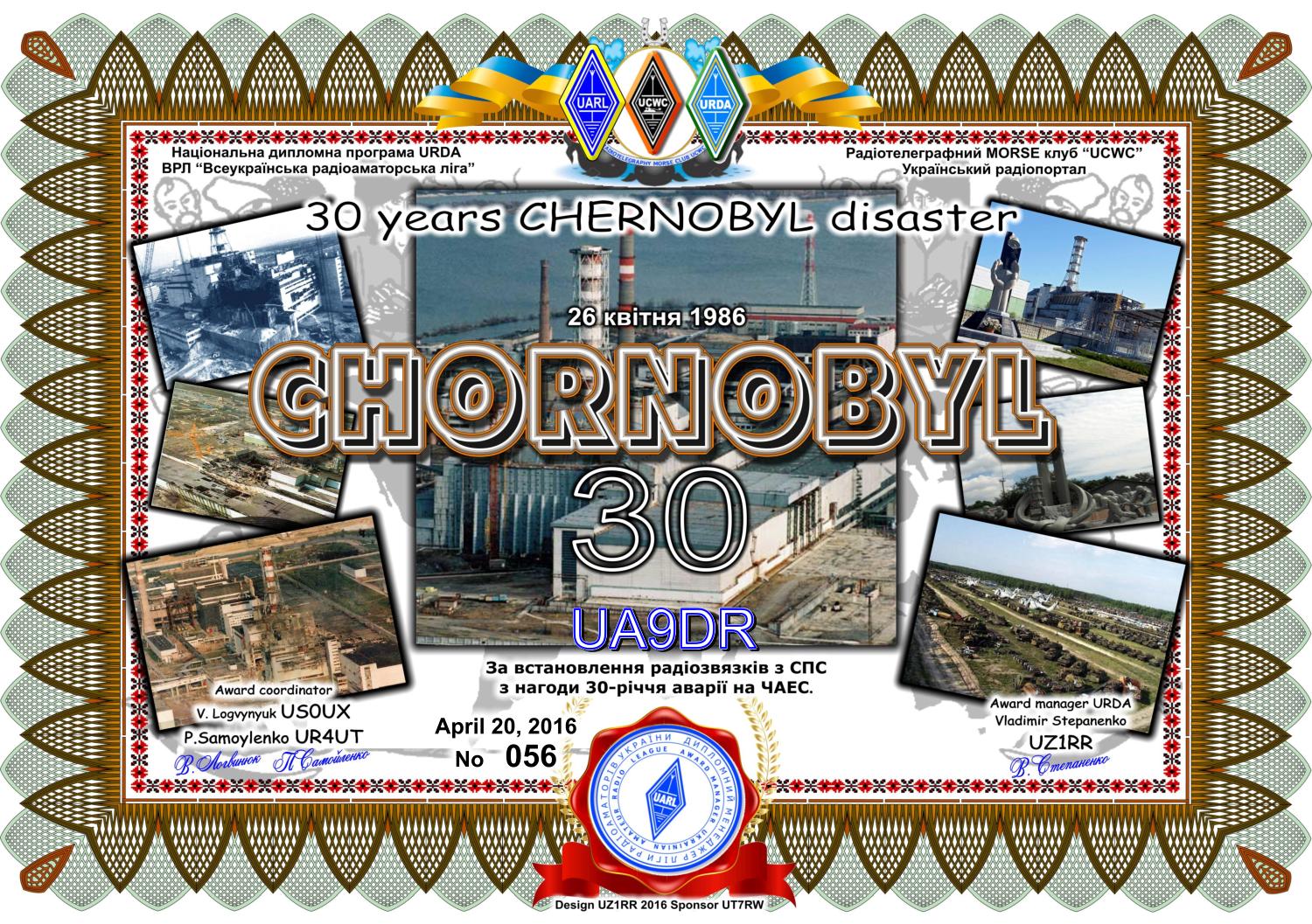 За один радіозвязок з EM70UFF, EO30UC, UR4UC/P та US5UCC/P видається електрононний чи паперовий диплом "Чорнобиль-30"