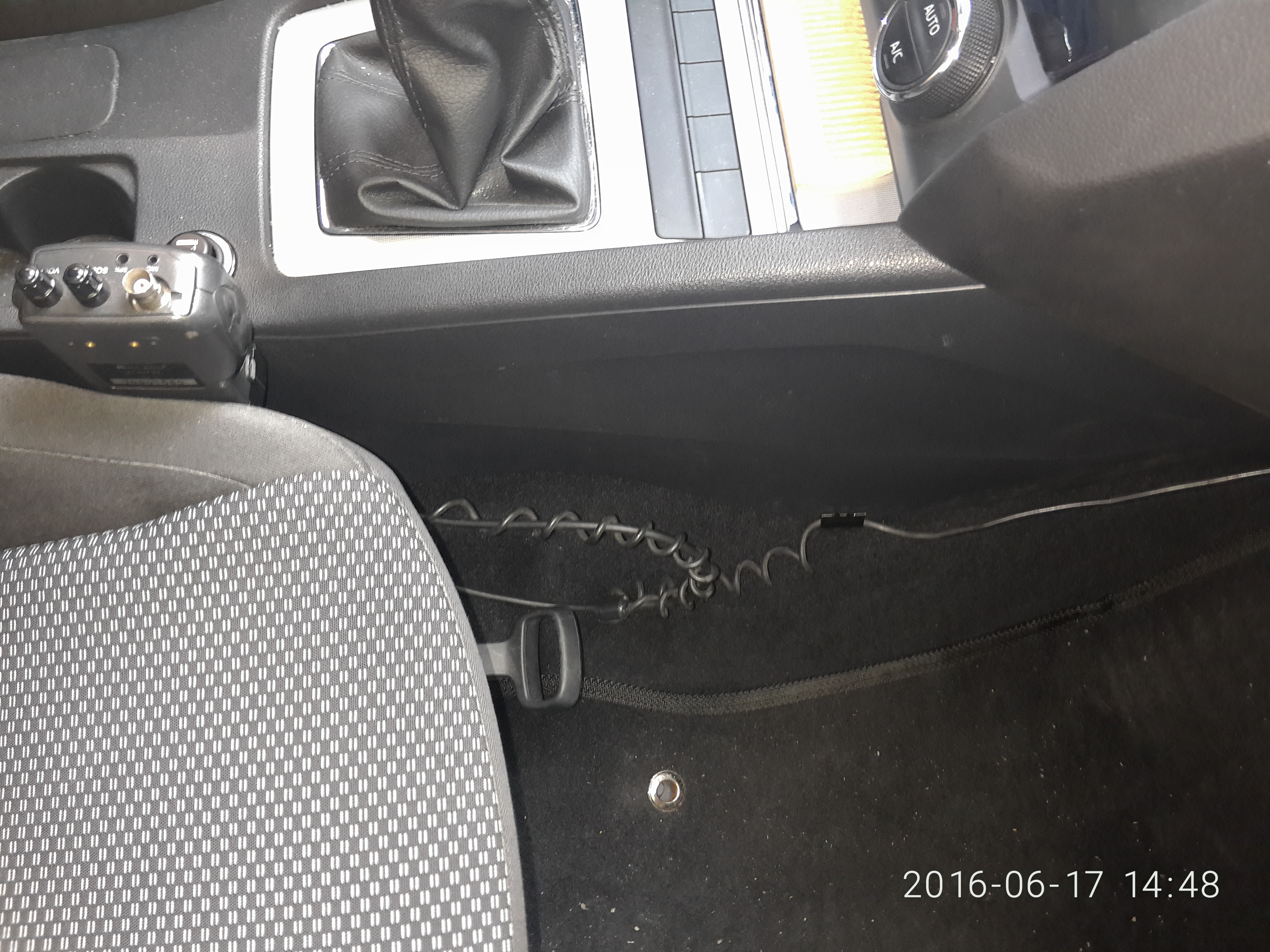Провод питания и антенный кабель никому не мешают и не бросаются в глаза. Со стороны водителя и задних сидений вообще не видны.