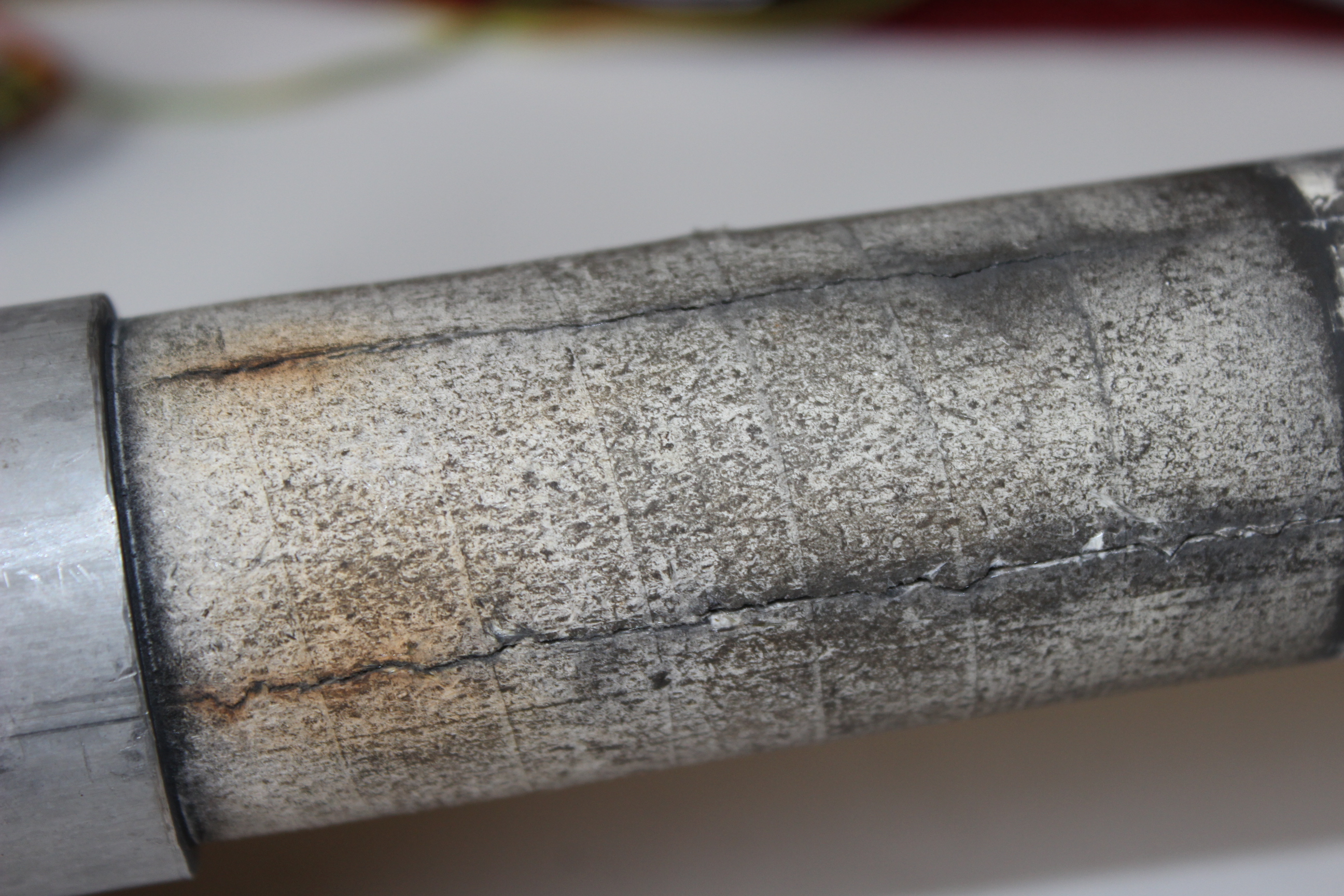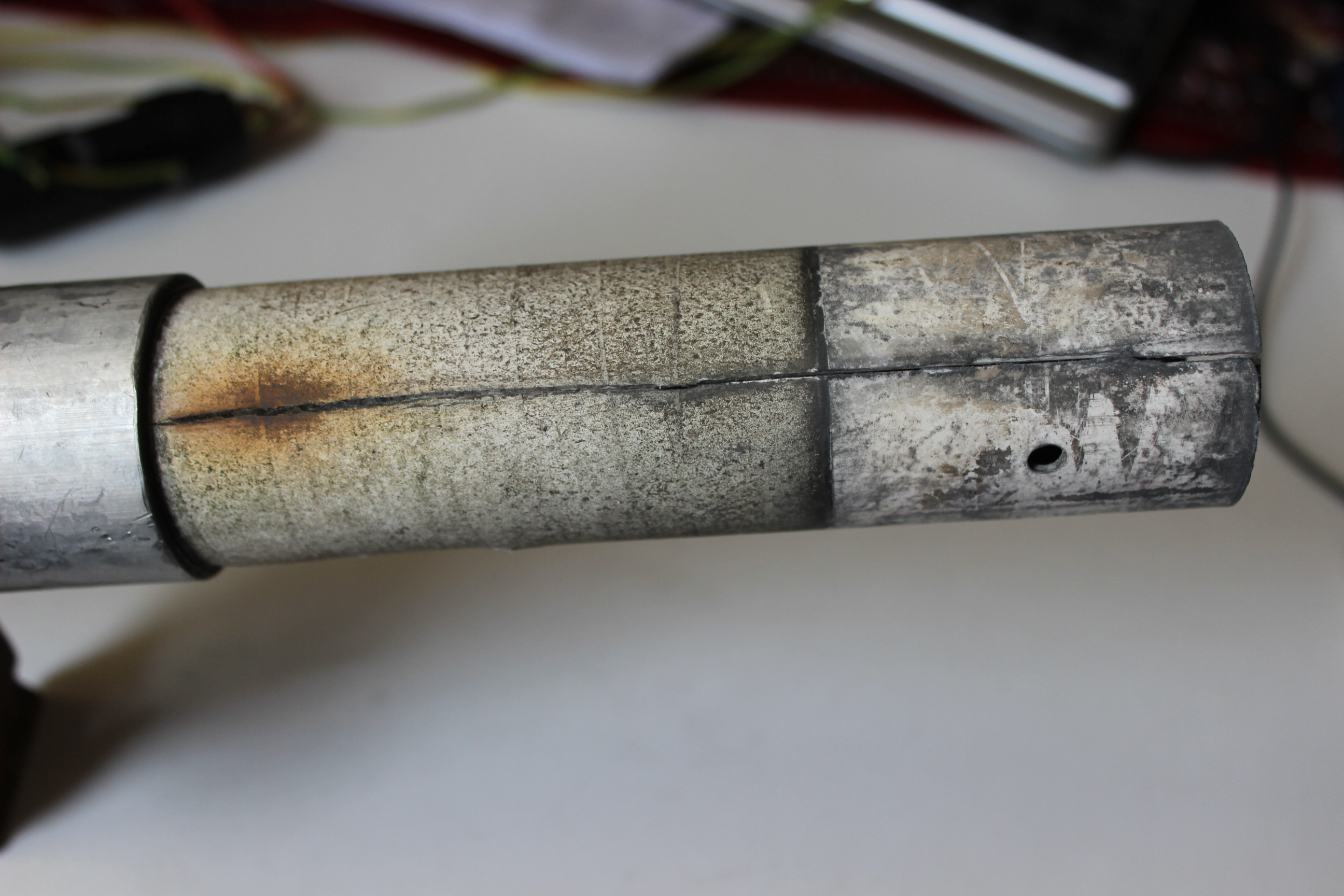 Толщина стенки этой трубки была всего 1,5 мм. Видимо в одну из зим в изолятор попала вода и замерзнув разорвала его вдоль, да еще и в нескольких местах.
