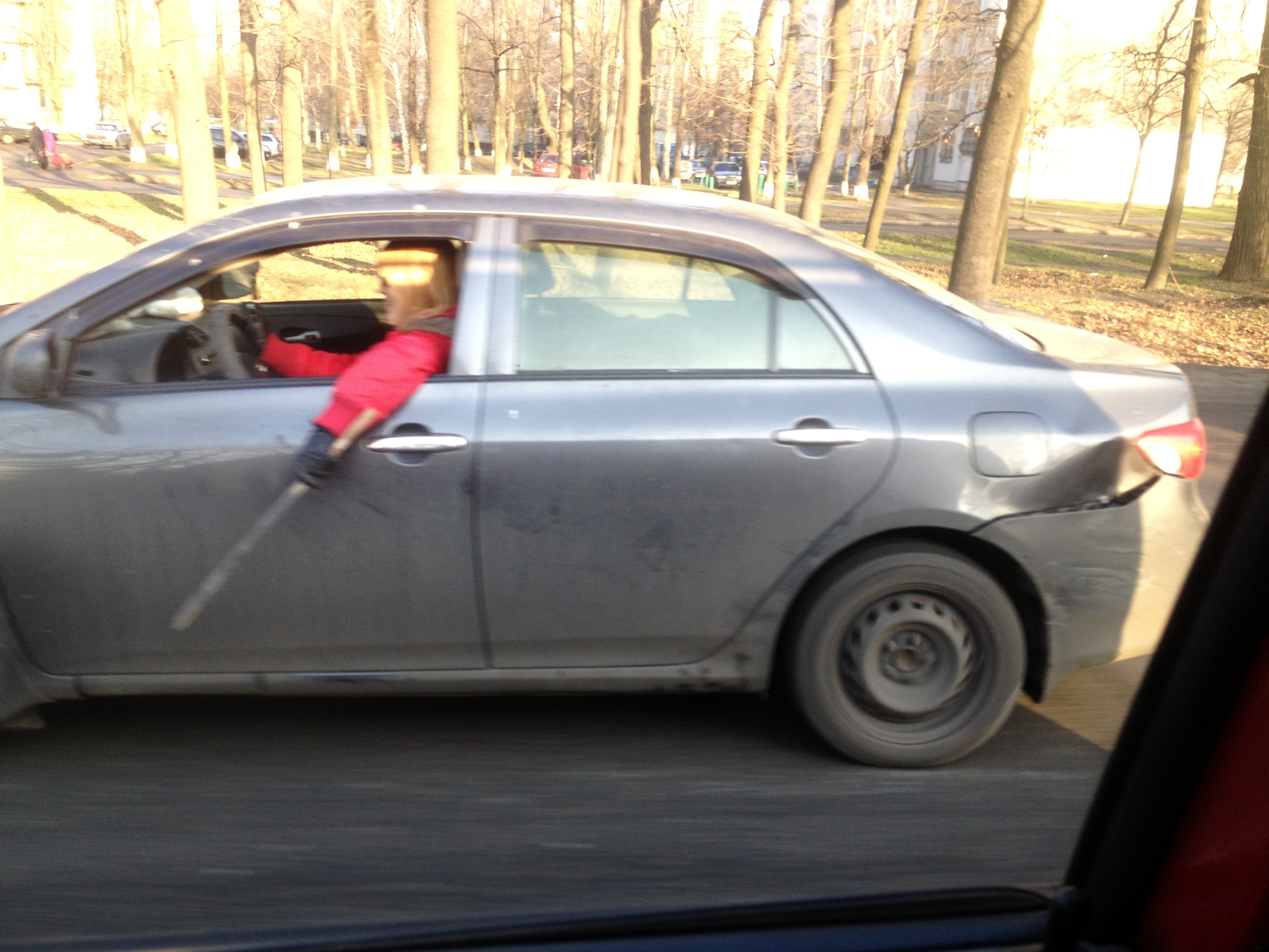 Блондинка средних лет, открытое окно, рука в перчатке, а в руке вроде шампур, тока пошире, и машет она ним, как шашкой!