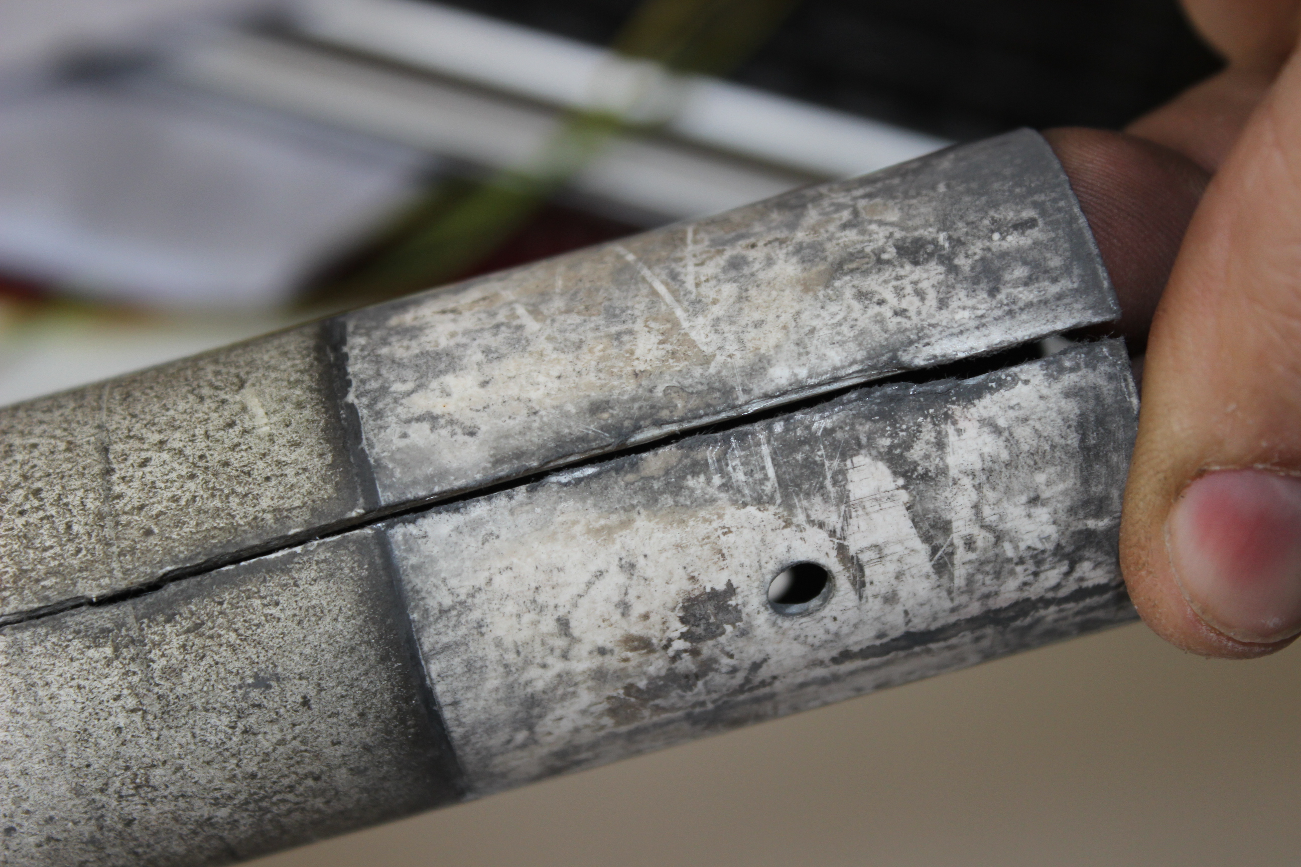 Толщина стенки этой трубки была всего 1,5 мм. Видимо в одну из зим в изолятор попала вода и замерзнув разорвала его вдоль, да еще и в нескольких местах.