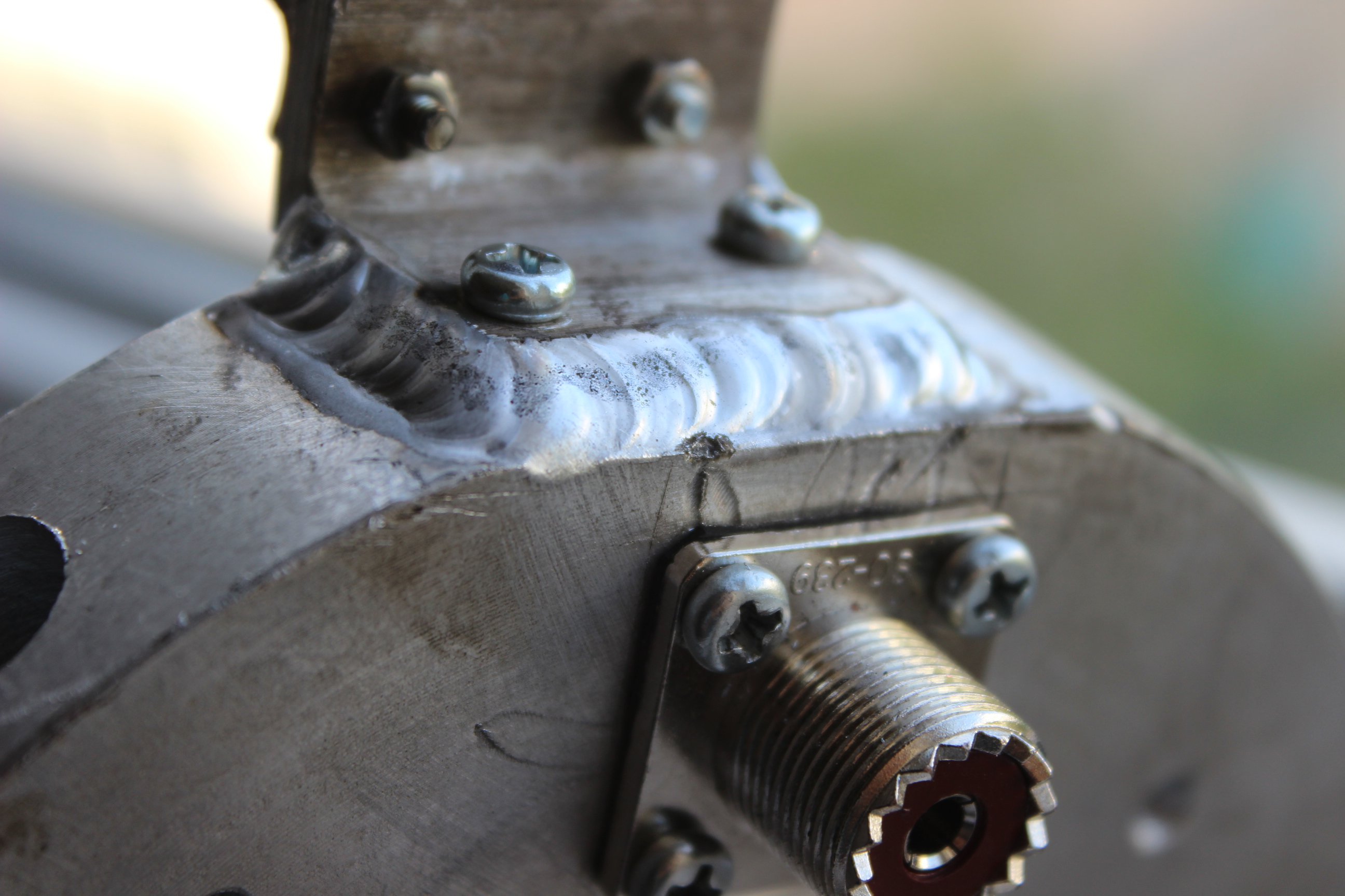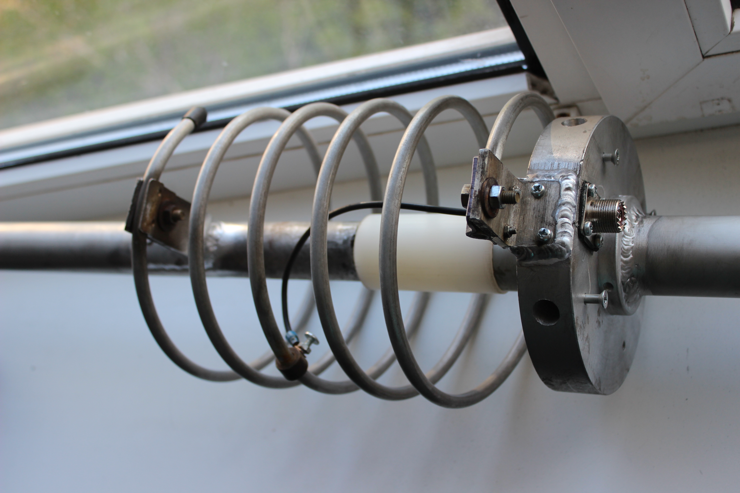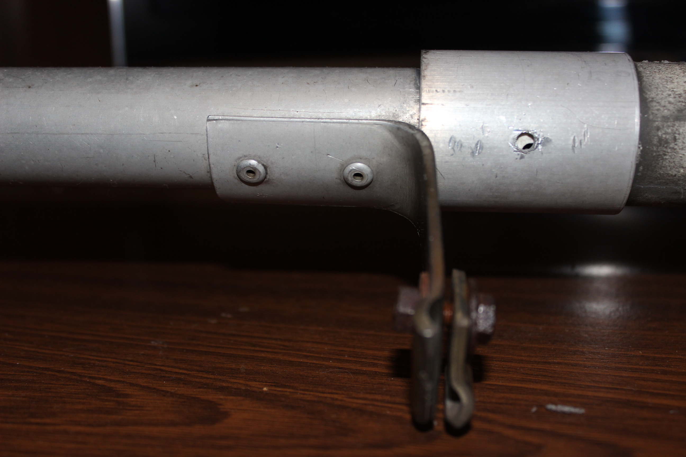 В итоге я сильно засомневался что данная деталь в таком виде выдержит ветровые нагрузки на крыше 16-ти этажного дома. Кроме того вызывали недоверие еще несколько узлов. Верхний держатель катушки антенны был просто приклепан двумя вытяжными заклепками к трубе вибратора.